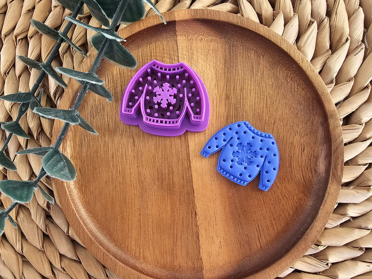Cortador Jersey Navideño para arcilla polimérica, ideal para añadir un toque cálido y festivo a tus proyectos. Este cortador cuenta con un diseño encantador de jersey decorado con un copo de nieve en el centro y pequeños puntitos que evocan un estilo invernal y acogedor