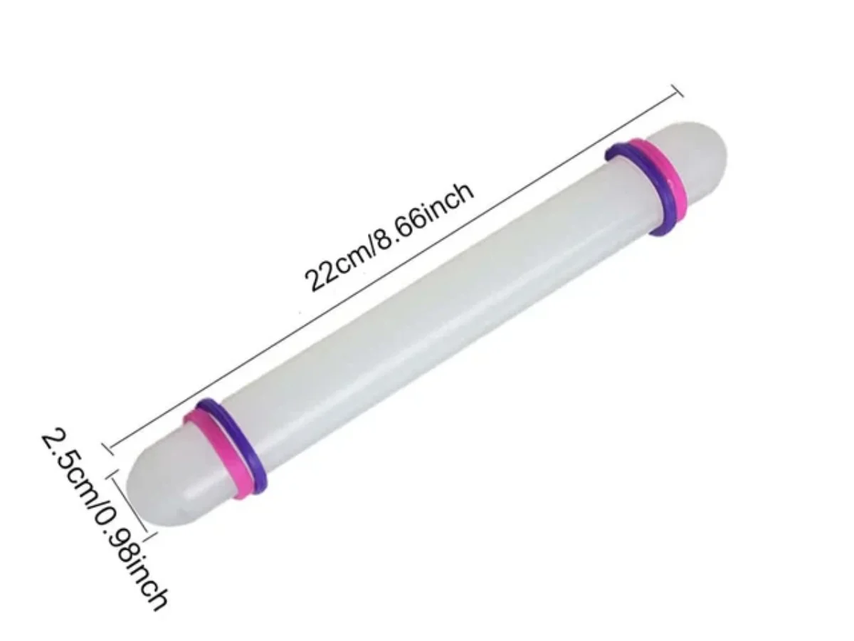 Rodillo de silicona de 22 cm con extremos equipados con gomitas como guías de profundidad. Perfecto para extender de manera uniforme y controlada diferentes materiales como arcilla polimérica, fondant o masa para modelar. Su diseño con gomitas garantiza un espesor consistente en tus proyectos creativos.
