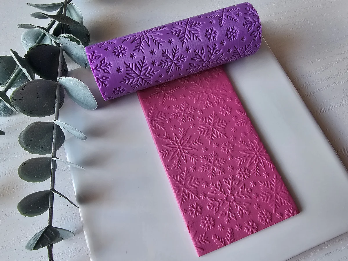 Rodillo Textura Copos de Nieve para arcilla polimérica con un encantador diseño de copos de nieve en distintos tamaños, ideal para dar un acabado festivo y detallado a tus creaciones. Este rodillo es perfecto para crear fondos y texturas únicas en joyería, adornos navideños y decoraciones de invierno.
