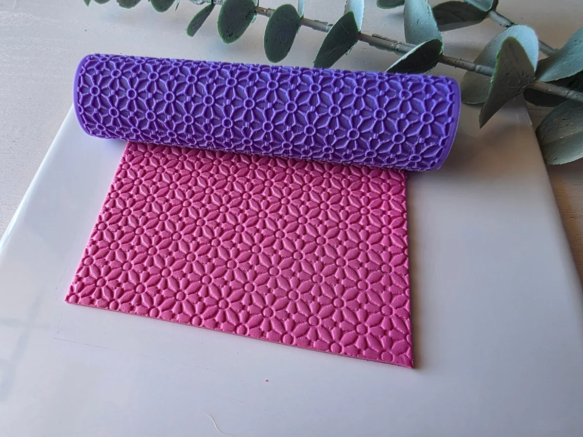 El Rodillo Textura Flor Geométrica permite crear superficies con un patrón floral repetitivo de estilo geométrico y equilibrado. Ideal para texturizar planchas de arcilla polimérica y aportar relieve uniforme a pendientes y piezas decorativas.