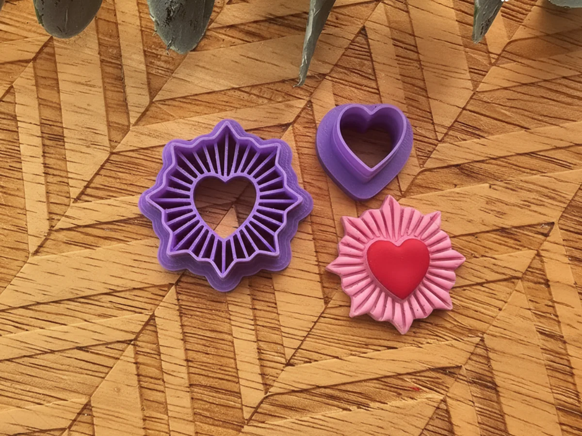 El Cortador Amor Solar es un set de dos cortadores diseñado para crear pendientes y piezas únicas en arcilla polimérica, con un estilo delicado y lleno de personalidad. Su diseño combina un corazón central con un efecto de rayos solares, aportando volumen, textura y un acabado muy especial a cada creación.