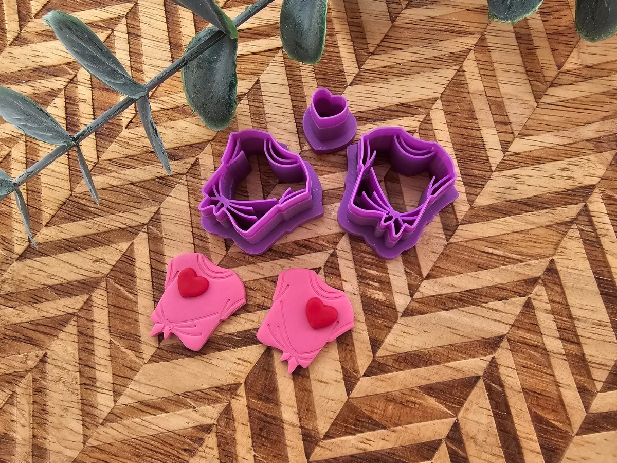 Cortador Camiseta Con Corazón para arcilla polimérica con efecto espejo para crear ambos lados correctamente alineados. Incluye un cortador de corazón adicional para detalles únicos. Disponible en tamaños de 25 mm a 40 mm, ideal para diseños creativos y personalizados.