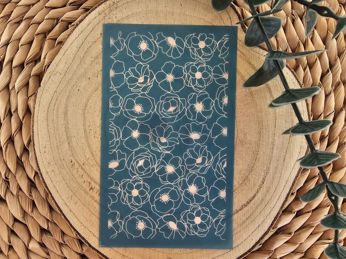 Método de empleo: pon la plantilla encima de la plancha de arcilla, extiende pintura acrílica. Levanta la plantilla y obtendrás el estampado.