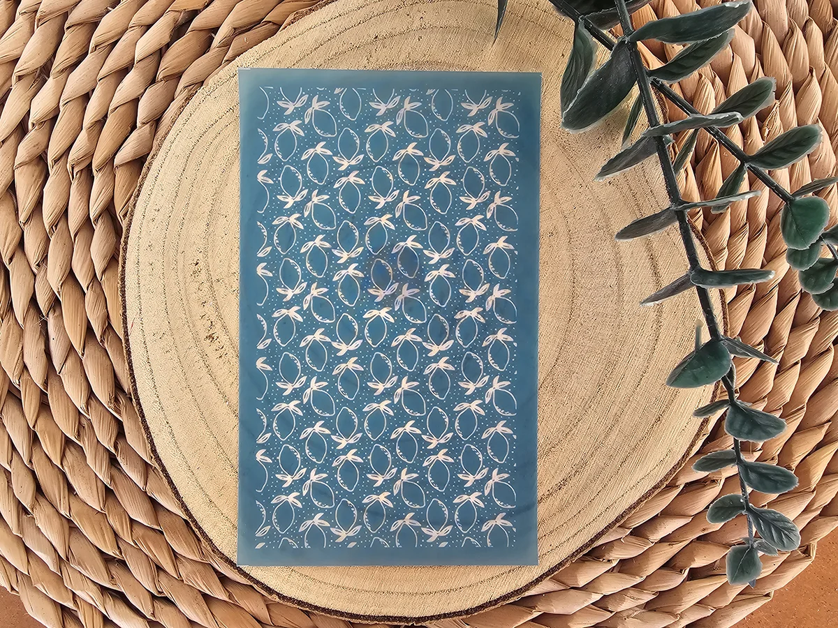 Silk Screen Limones: Un diseño vibrante y refrescante inspirado en la esencia del verano, este silk screen presenta un patrón de limones con detalles en hojas. Los limones están dispuestos de manera armoniosa, perfectos para dar un toque de frescura y energía a tus creaciones en arcilla polimérica.